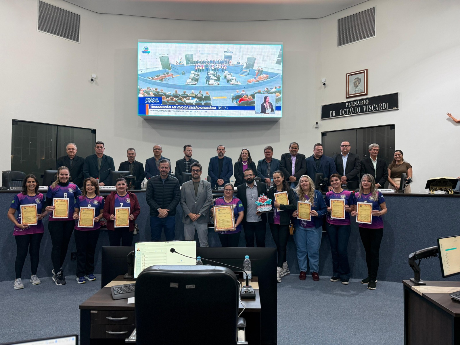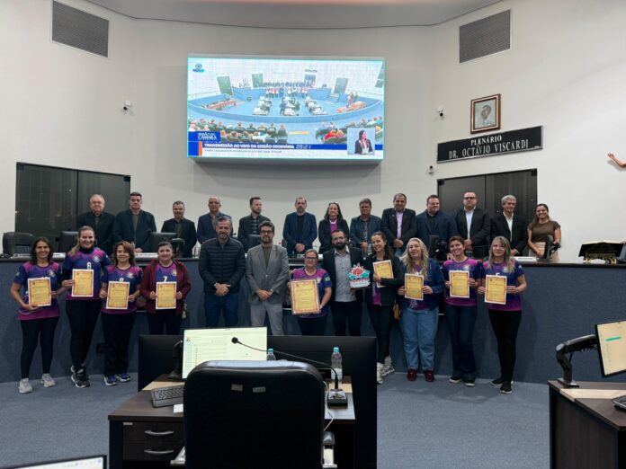 Na noite desta segunda-feira (11), durante a sessão ordinária da Câmara Municipal de Votuporanga, os vereadores prestaram uma homenagem à equipe de vôlei master feminino da Secretaria Municipal de Esportes e Lazer pela conquista do título de campeã da Série Bronze no torneio Água Fest Vôlei Master Internacional, realizado durante os Jogos de Inverno na cidade de Águas de São Pedro.